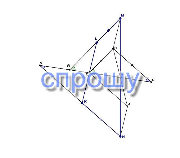 Возьмем точки А и В так, чтобы XKNA и XLMB были параллелограммами и продлим XY за точку Y на свою длину до точки С (см. рис). Треугольник ANY равен треугольнику BMY по двум сторонам и углу между ними (AN=XK=XL=BM, NY=MY и ∠ANY=∠BMY как внутренние накрест лежащие, т.к. АN||KL||MB и MN - секущая). Значит AY=BY, т.е. AXBC - параллелограмм. Тогда ∠KVX=∠AXY=∠XCB, ∠LWX=∠BXC, BC=XA=KN и BX=LM, а т.к. по условию LMlt;KN, то BXlt;BС. Т.к. в любом треугольнике (в том числе XCB) напротив меньшей стороны лежит меньший угол, то ∠XCBlt;∠BXC, а значит и ∠KVXlt;∠LWX.