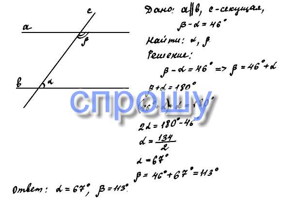 Найдите односторонние углы ,образованные при пересечении двух паралельных прямых a и b третей спрямой с,зная что разность этих односторонних углов равна 46 градусов.