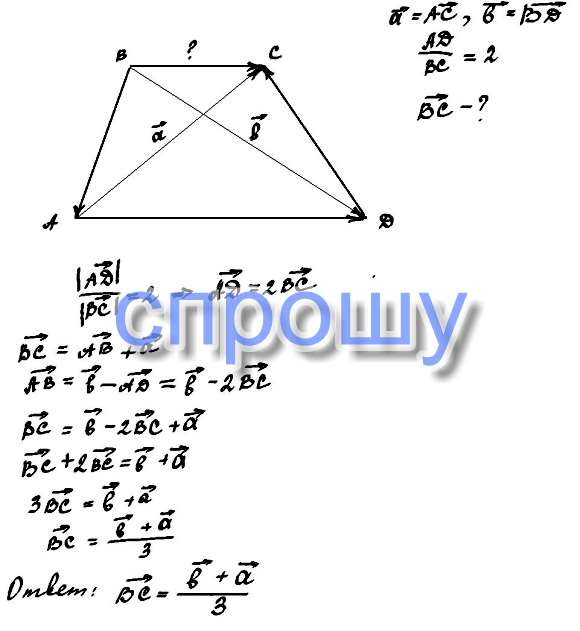В трапеции ABCD отношение длины основания AD к длине основания BC равна 2.Выразить вектор BC через а = AC и b = BD