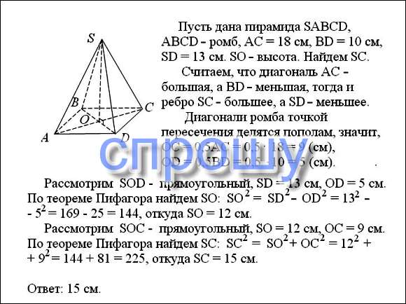 Основание пирамиды ромб с диагоналями 10 и 18. Высота пирамиды проходит через точку пересечения диагоналей ромба. Меньшее боковое ребро пирамиды равно 13 см. Найдите большее боковое ребро пирамиды