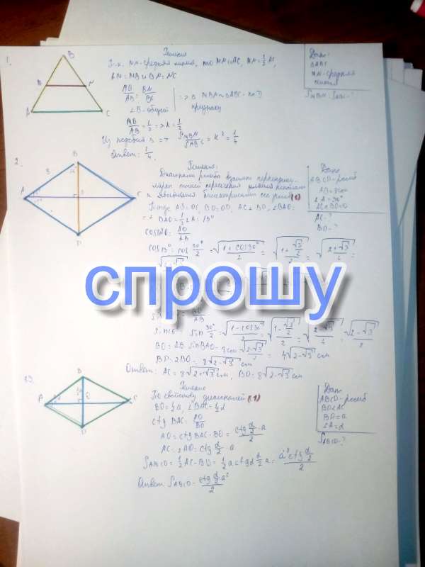 Помогите срочно пожалуйста<br />10. Средняя линия разбивает тругольник на 2 фигуры <br />Найдите отношение их_ площадей. [1:4] ? <br />11. Сторона ромба равна 8 см а острый угол 30 градусов Найдите Диагонали ромба<br />ромба? <br />12. Найдите площадь ромба по <br />меньшей диагонали к и острым углом Альфа[0,5к^2сtg альфа/2]