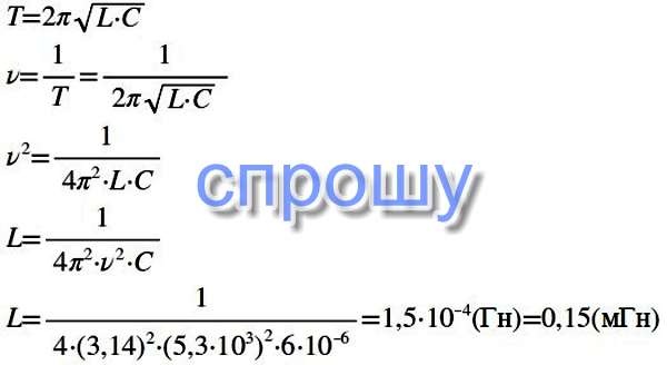 Собственная частота электромагнитных колебаний в контуре 5,3 кГц. Определите индуктивность катушки, если емкость конденсатора 6 мкФ