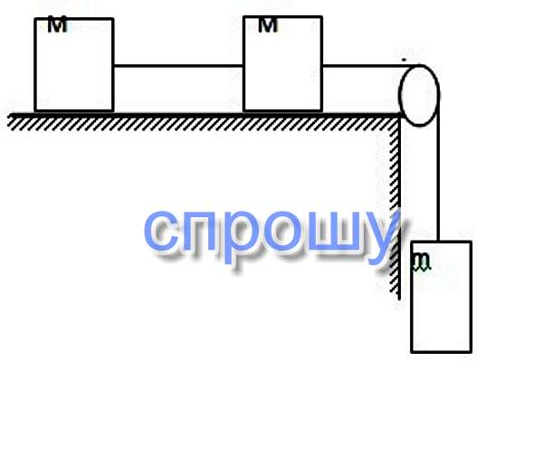 Два бруска одинаковой массы M = 1 кг связаны между собой и соединены с грузом массой m = 800 г нитью, перекинутой через блок. При каких значениях коэффициента трения µ между брусками и столом система будет находиться в покое? Блок считать невесомым.