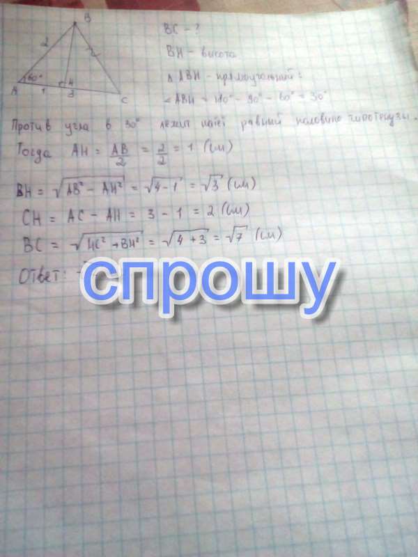 В треугольнике АВС угол А = 60градусов, АВ = 2см АС = 3см Найти сторону ВС
