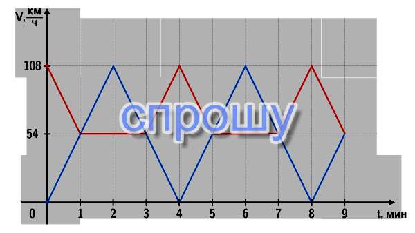 Площадь фигуры, соответствующая относительному перемещению от 5-ой до 7-ой минуты равна по модулю площади фигуры, соответствующей относительному перемещению от 7-ей до 8-ой минуты. А значит относительное расстояние в момент времени «5 минут» будет равно относительному расстоянию в момент времени «8 минута».