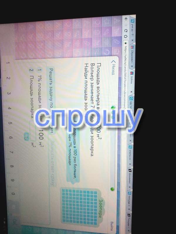 700м^2 это 7 площади зоопарка. Нужно найти 100, поэтому составляем проплрцию: