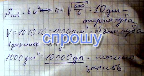 Сколько децилитров квадратных можно налить в куб если его поверхность 600 дециметров квадратных