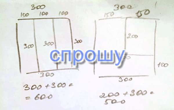 1)300*300=90000 (кв ед) площадь всего участка 2) 90000:3=30000(кв ед) площадь каждого прямоугольника должна быть. На фото внизу показано, как могут быть расположены участки. В первом случае, если участки параллельны длина забора 300+300=600 ед если рядом два участка, а третий снизу (сверху), то 200+300=500 ед. Ответ: 500 ед (единицы измерения укажите сами, вы не написали)