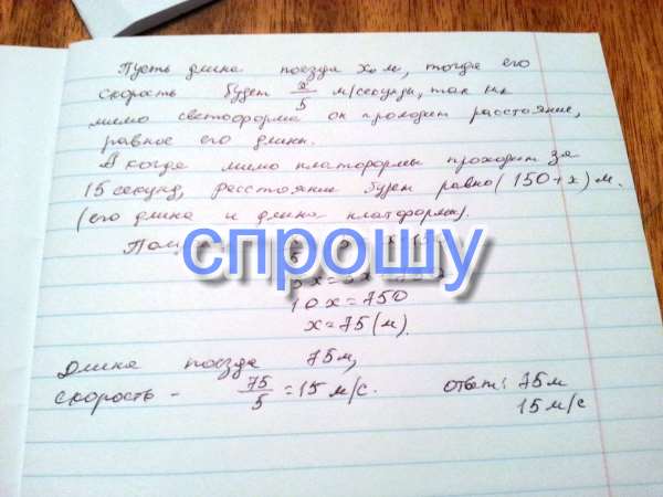 Поезд проходит мимо светофора за 5 секунд, а мимо платформы длиной 150 м за 15 сек. Найдите длину поезда и его скорость.