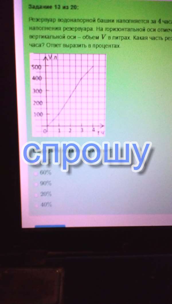 Помогите решить задачу и резервуаров водопроводной башни наполняется за 4 часа на рисунке приведён график наполнения резервуара на горизонтальной оси отмечено время в часах на вертикальной оси объем Какая часть резервуара наполнится за первые 3 часа выразить в процентах