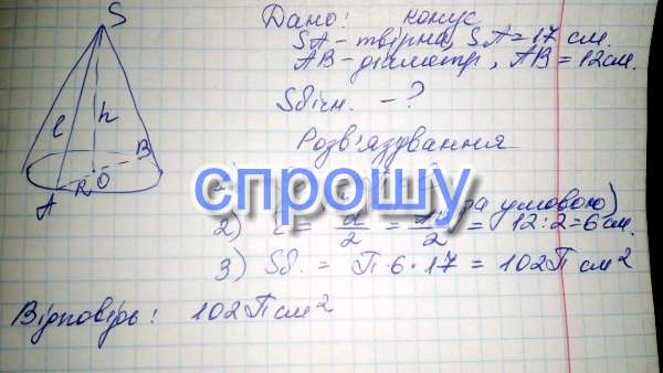 Обчисліть площу бічної поверхні конуса діаметр основи якого 12 см а твірна 17