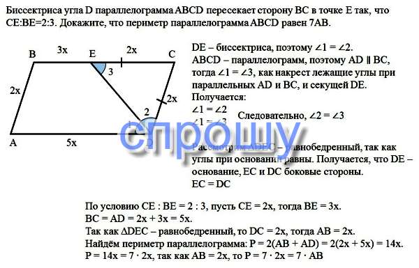 Биссектриса угла D параллелограмма ABCD пересекает сторону BC в точке E так, что CE:BE = 2:3. Докажите, что периметр параллелограмма ABCD равен 7AB. Заранее, огромное СПАСИБО!