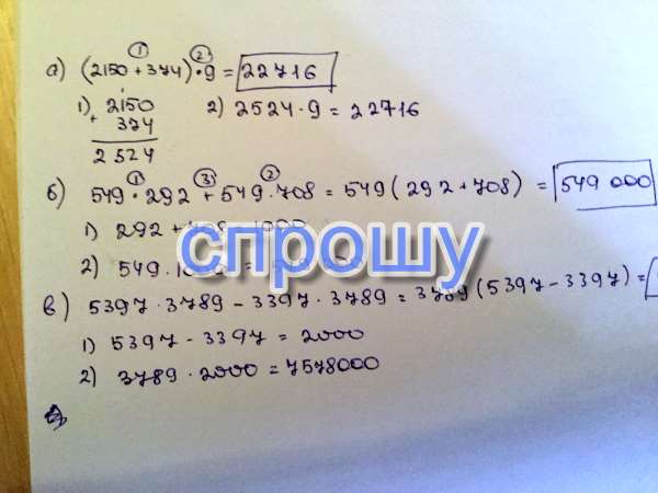 (2150+374)*9; Б)549*292+549*708; В)5397*3789-3397*3789.