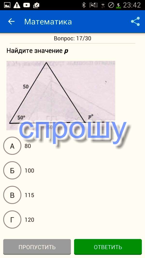Данный треугольник равнобедренный, значит, углы при основании равны. сумма градусных мер углов треугольника равна 180°. найдем угол при основании: (180-50):2=65° (мы нашли угол, смежный с углом р°). сумма градусных мер смежных углов равна 180°, следовательно, р°=180°-65°=115°