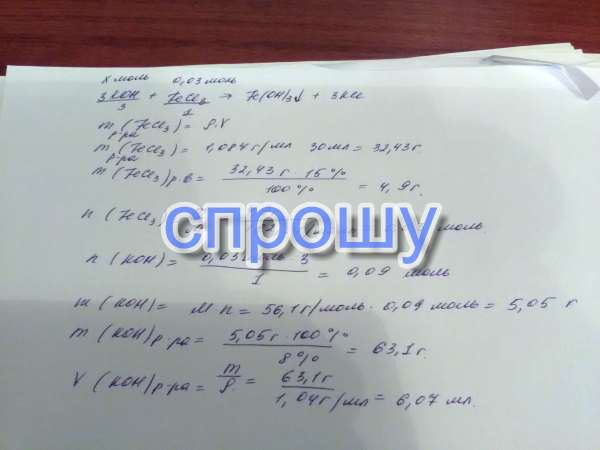 Сколько миллитров 8% ного (p = 1.p4г/мл) гидрооксида калия надо добавить к 30 мл 15% ного (p = 1.087 г/мл) раствора хлорида железа (III), чтобы оброзовать Fe(OH)3