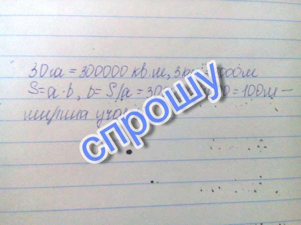 Площадь земельного участка прямоугольной формы 30га .Найдите ширину этого участка,если его длина 3 км
