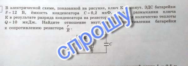 В электрической схеме, показанной на рисунке, ключ K замкнут. ЭДС батарейки 12 в. Емкость конденсатора равна 0,2 мкф. После размыкания ключа K в результате разряда конденсатора на резисторе выделяется количество теплоты 10 мДж. Найти отношение внутреннего сопротивления батарейки к сопротивлению резистора r/R.