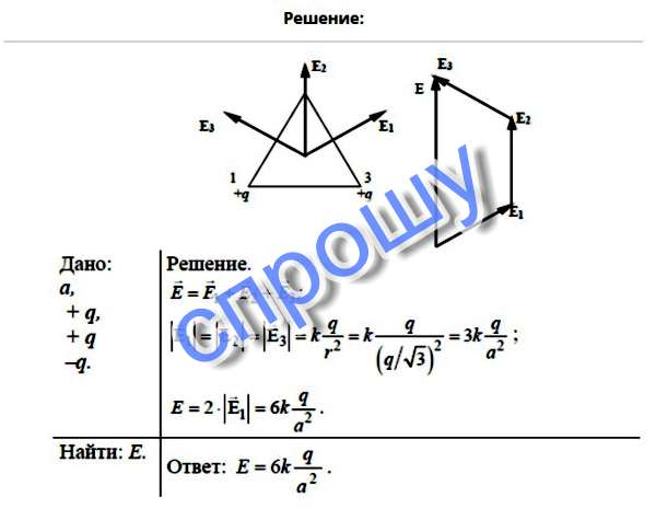 В двух вершинах равностороннего треугольника расположены два положительных точечных заряда q , а в третьей-такой же по модулю отрицательный заряд.Определите напряженность и потенциал в центре треугольника ,если его сторона = d