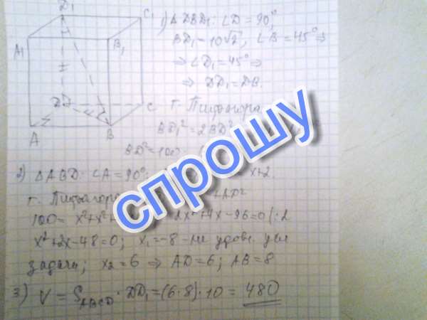 Задача если одна сторона основания прямоугольного параллелепипеда больше другой на 2см, а диагональ равна 10√2см и образует с плоскостью основани углов 45°