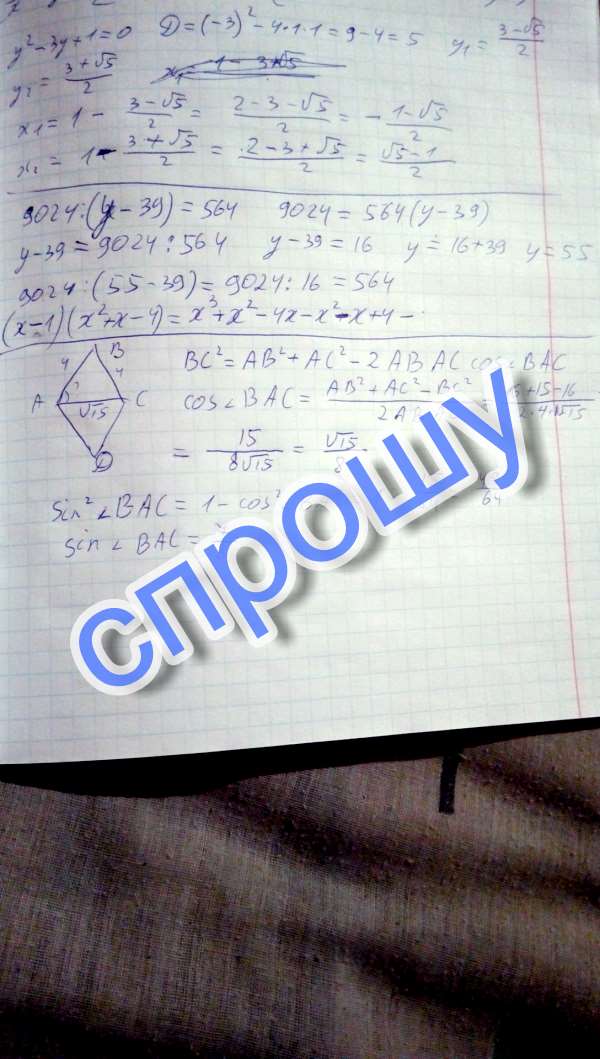 В ромбе abcd ab = 4, ac = Корень из 15. Найдите синус угла bac