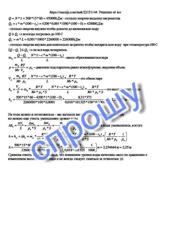 В цилиндре под невесомым поршнем площадью S = 100 см2 находится m = 1 кг воды при температуре 0°С. В цилиндре включают нагреватель мощностью N = 500 Вт. На сколько поднимется поршень за