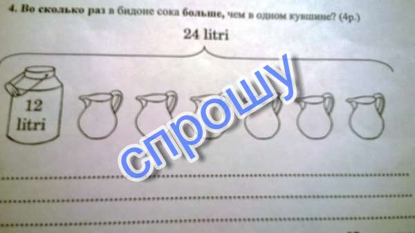 Тк ёмкость бидона равна 12, а кувшина 2, то разделим 12 на 2 и получим 6. Ответ: Вместимость бидона больше вместимости кувшина в 6 раз.