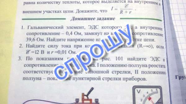 I=ЭДС /(R+r)=5/(39,6+0,4)=5/40=0,125 A, по закону Ома I=U/R, U=IR 0,125*39,6=4,95В