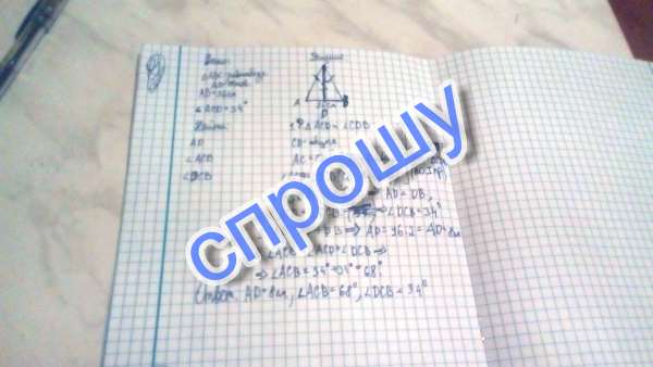 Из свойств равнобедренного треугольника: боковые стороны равны, углы при основании равны, биссектриса (она делит угол пополам!) = медиане (она проводится из вершины угла к середине противолежащей стороны!) и = высоте (она перпендикулярна противолежащей стороне!). Нам известно: основание АВ=16 см., отсюда АD=АВ/2=16/2=8см. АСD=34°, АСD=DСВ=34°, АСВ= АСD+DСВ=34°+34°=68°
