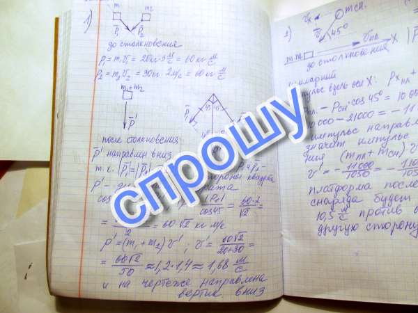 Снаряд массой 50кг летит под углом 45градусов к горизонту со скоростью V1 = 600м/с и массой 1000 кг, которая движется навстречу снаряду со скоростью V2 = 10м/c. Определите скорость совместного движения платформы и снаряда