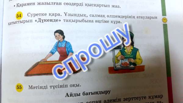 Анам маған дүкенге барып келуімді айтты. Дүкеннен 1 нан және 2л сүт алып кел деди. Мен дүкенге барып, анам айтқан нәрселерди алдым да, қалған ақшаға 1 кг кәмпит сатып алдым. Уйге келген соң әжем екеуміз мата сатылатын дүкенге бардық. Мата дүкенінен әжем 2метр сары және 3 метр көк мата сатып алды.
