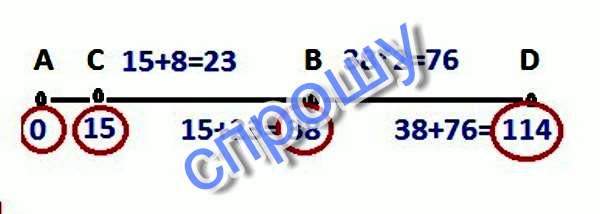 Как решить задачу по математике.На отрезке AD отмечены точки C и B так,что C лежит между точками A и B.Найдите длину отрезка AD, если длина отрезка AC равна 15 см, длина отрезка CB на 8 см больше длины отрезка AC ,а длина отрезка BD в 2 раза больше длины отрезка AB