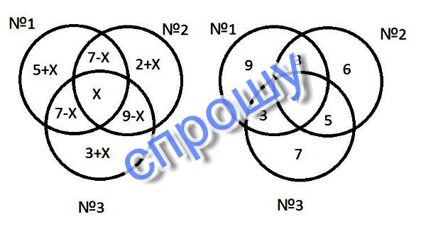 Пусть х - количество учеников, которые решили все задачи, тогда (7-х) - решили только №1 и №2, (9-х) - решили только №2 и №3, (7-х) - решили только №1 и №3. 19-(7-х+х+7-х)=5+х - решили только №1, 18-(7-х+х+9-х)=2+х - решили только №2, 19-(9-х+х+7-х)=3+х - решили только №3.