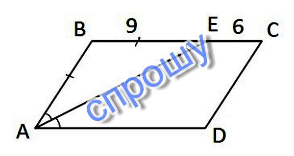 Пусть ABCD - параллелограмм, АЕ - биссектриса ∠BAD, отрезок ВЕ=9 см, ЕС=6 см. ΔАВЕ - равнобедренный (∠EAD=∠AEB - внутренние накрест лежащие углы при параллельных AD и BC и секущей АЕ), значит АВ=ВЕ=9 см. Так как противолежащие стороны параллелограмма равны, то AB=CD=9 см, BC=AD=9+6=15 (см).