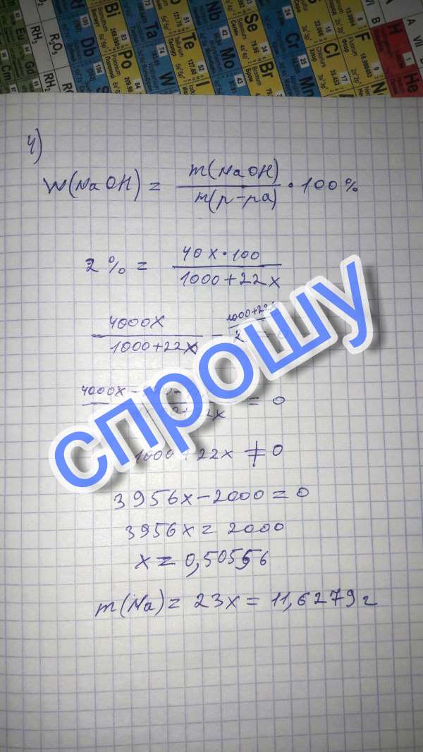 Какую массу(г.) металлического натрия надо взять чтобы при его взаимодействии с 1л. Воды(p = 1 г/мл) образовался 2%-ух раствор гидроксида натрия? Плотность раствора гидроксида натрия примите равной 1 единицы (1г/мл)