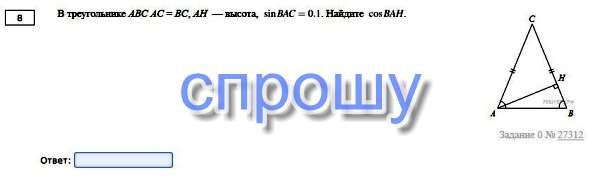 Из ΔAHB, где ∠H-прямой: cosBAH=cos(90-ABH)=0,1