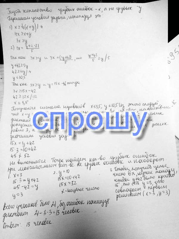 В классе 21 человек. При проверке диктанта в классе оказалось, что грубые ошибки составляют не меньше четверти всех ошибок. Если бы каждый ученик сделал в 3 раза больше грубых ошибок и на 2 больше негрубых, то число грубых ошибок стало бы ровно в 5 раз меньше числа негрубых. Какое наименьшее число учеников могло написать диктант вообще без ошибок?