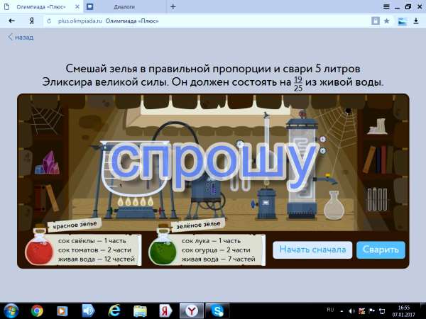 Помогите!!Смешай зелье в правильной пропорции и свари 5 литров эликсира великой силы.Он должен состоять на 19/25 из живой воды