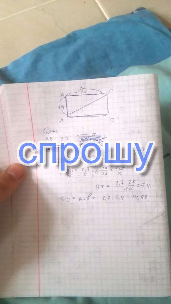 В прямоугольнике диагональ делит угол в отношении 1:2, меньшая сторона равна 2,7. найти площадь