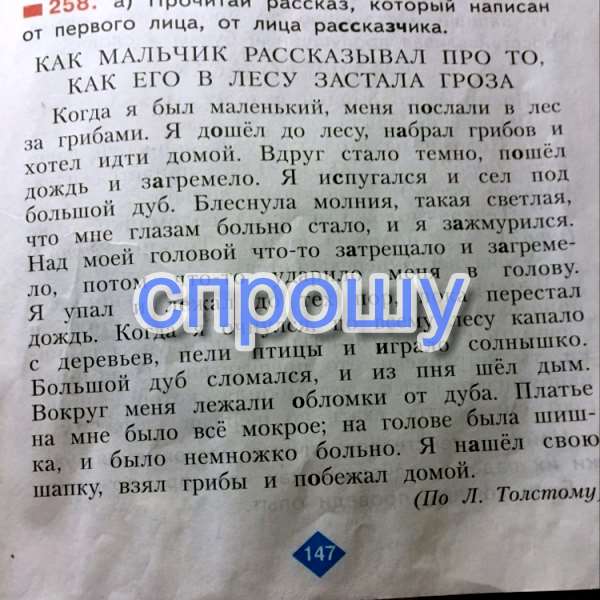 Как - то одного маленького мальчика отправили в лес за грибами. Он собрал грибов и решил пойти домой, но вдруг стало темно, пошел дождь и загремело. Он испугался и сел под большой дуб. Когда блеснула светлая молния его глазам стало больно и он зажмурился. Над его головой что затрещало, зашумело и, что - то упало ему на голову. Он упал и лежал пока дождь не закончился. Когда он очнулся то увидел что по всему лесу капало с деревьев, пели птицы и играло солнышко. Дуб сломался, а из пня шел дым. Вокруг него лежали обломки дуба, а все его платье было мокрое, на голове была шишка и голова немного болела. Он нашел свою шапку, взял корзину с грибами и побежал домой.
