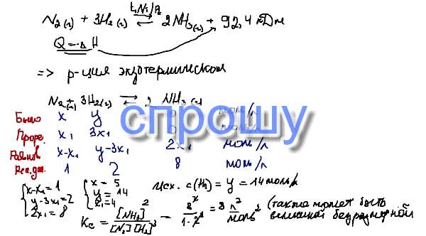 В гомогенной системе N₂ + 3H₂ = 2NH₃; ΔН°х.р. = –92,4 кДж равновесные концентрации реагирующих веществ составили [N₂] = 1; [H₂] = 2; [NH₃] = 8 моль/л. Вычислите константу равновесия данной системы и исходную концентрацию водорода. В какую сторону сместится равновесие в системе при повышении температуры: а) сдвинется влево; б) сдвинется вправо; в) останется неизменным?