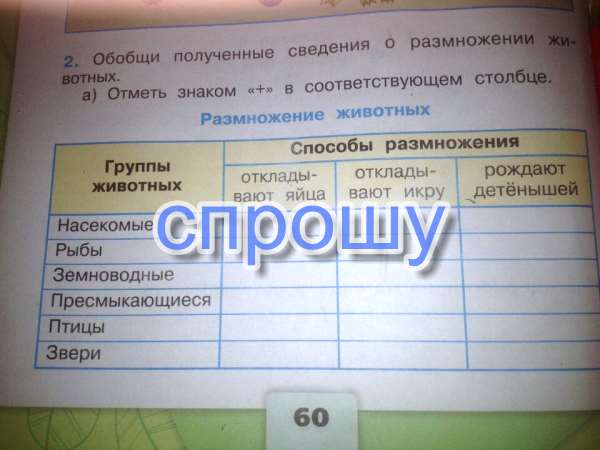 Насекомые, земноводные, пресмыкающиеся, птицы откладывают яйца. Рыбы откладывают икру, а звери рождают детёнышей.