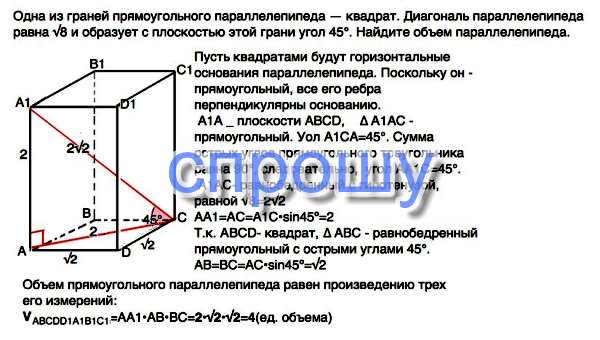 . Одна из граней прямоугольного параллелепипеда — квадрат. Диагональ параллелепипеда равна √8 и образует с плоскостью этой грани угол 45°. Найдите объем параллелепипеда.
