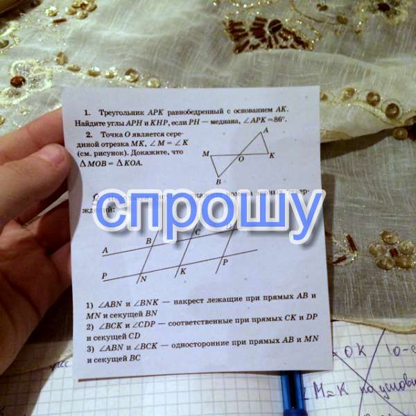 2. МО = ОК (по условию), угол М = углу К (по усл.), угол МОВ = углу АОК (по свойству вертикальных углов). Значит, эти треугольники равны (по стороне и двум прилежащим углам).