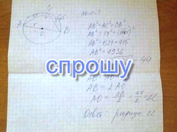 В треугольнике abc известно, что ,ac-39 bc-V415 , угол C равен 90°. Найдите радиус описанной окружности