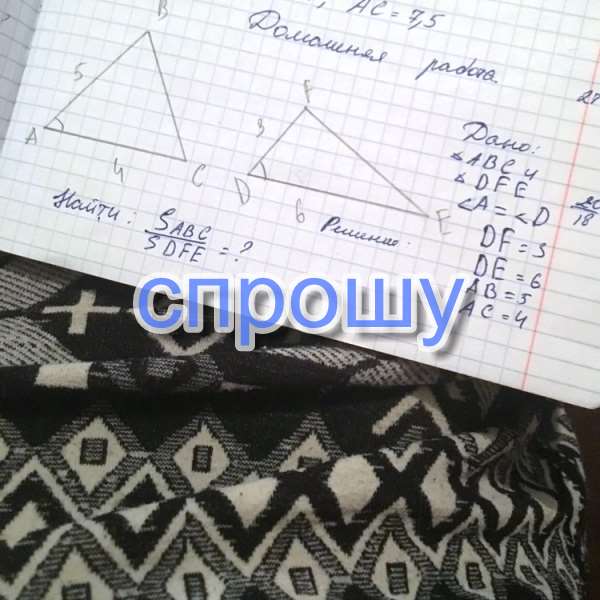 Площади треугольников относятся как произведения сторон, заключающих равные углы. Значит, отношение площадей равно: (АВ · АС) : (DF ·DE) = 20: 18= 10/9.
