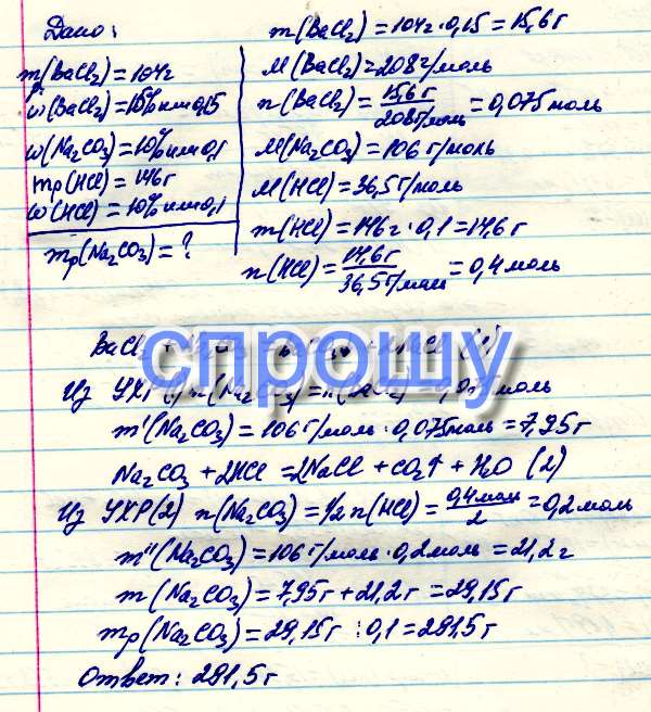 К 104 г 15-процентного раствора хлорида бария был прилит избыток 10-процентного раствора карбоната натрия. Образовавшийся осадок отфильтровали, а на фильтрат подействовали соляной кислотой до полного прекращения выделения газа. При этом израсходовали 146 г 10-процентного раствора кислоты. Определите массу исходного раствора карбоната натрия