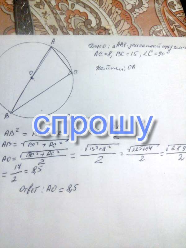 В треугольнике ABC известно, что AC = 8 ,BC = 15 , угол C равен 90 градусам . Найдите радиус описанной около этого треугольника окружности.