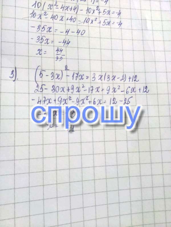 Решите ураанение: 1) (3-2х)^2-(2х-2)^2 = 4; 2) 10(х-2)^2-5х(2х-1) = -4; 3) (5-3х)^2-17х = 3х(3х-2)+12; Решите срочно,пожалуйста.