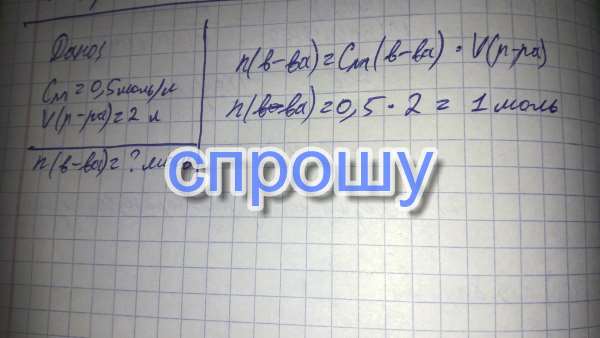 Определите, какое количество вещества содержится в растворе сахара молярной концентрации 0,5моль/л, если обьем раствора 2л.