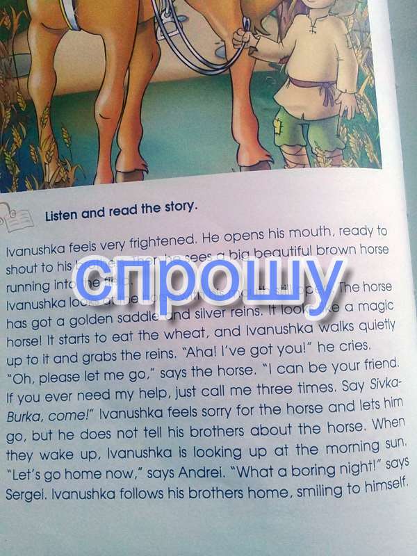Иванушка смотрит на этого коня со все еще раскрытым ртом. На коне есть золотое седло и серебряные поводья. Он выглядит, как волшебный конь! Он начинает есть пшеницу, и Иванушка тихонечко подходит к нему и хватает поводья. "Ага! Попался!" - кричит он. "О, пожалуйста, отпусти меня, - говорит конь. Я могу быть твоим другом. Если тебе когда-нибудь понадобится моя помощь, просто позови меня три раза. Скажи "Сивка-Бурка, приди!" Иванушка чувствует себя виновным перед конем и отпускает его, но не рассказывает своим братьям об этом коне. Когда они просыпаются, он смотрит на утреннее солнце. "Пойдемте домой," - говорит Андрей. "Что за скучная ночь!" - говорит Сергей. Иванушка идет со своими братьями домой, улыбаясь самому себе.